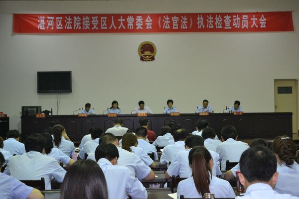 会上,副院长王建民传达了湛河区政法委书记王奇在区动员会上的讲话;副院长闻延辉传达了区人大副主任冯中建在区动员会上的讲话;副院长张杰传达了区法院《关于接受区人大常委会开展<法官法>执法检查的实施方案》;民二庭庭长刘威就执法检查代表全院干警作表态发言;院党组书记、院长张学玲作了动员讲话;区人大副主任郑秀奇就如何扎实有效地推动《法官法》执法检查活动作了重要讲话。