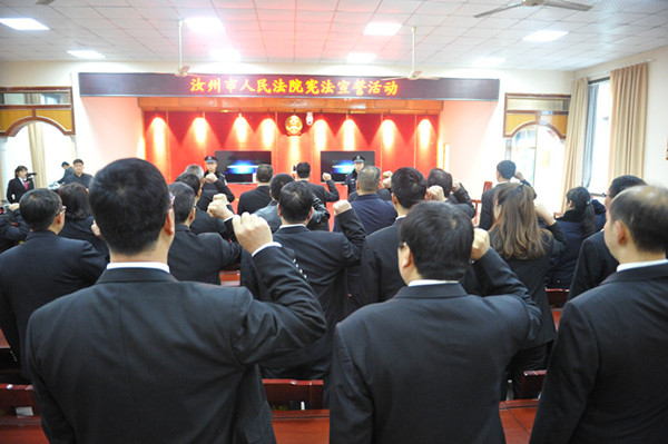 上午10时15分,在汝州法院一号审判庭,30多名法官代表在党组副书记、常务副院长于占琦带领下,面对国旗,进行了庄严的宪法宣誓。