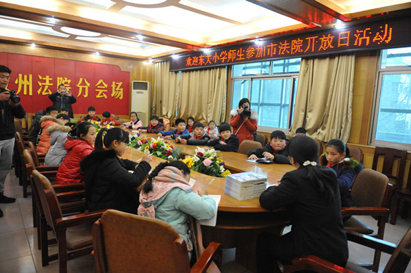 宣誓活动前,东关小学的30余名小学生在老师的带领下走进法院,先后参观了立案大厅、民事庭、刑庭、少审庭、文明建设展厅、廉政文化长廊等。参观中,法官用通俗易懂的语言向同学们介绍了人民法院的工作职责、组织机构等。在二楼会议室,少审庭副庭长邵存霞以“远离犯罪,健康成长”为题,以案说法,为同学们上了一堂生动的法制课。她希望同学们遵守法律法规及社会公共道德规范,树立自尊、自律、自强意识,增强辨别是非和自我保护能力,自觉抵制各种不良行为及违法犯罪行为的引诱和侵害,远离犯罪、健康成长,做遵纪守法的好学生。课堂上,法院工作人员还为同学们发放《给女孩儿的一封信》及《让法律照亮留守儿童回家的路》等法律小册子。