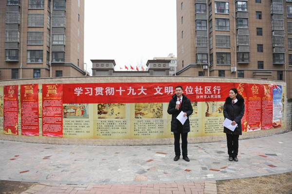 在社区内,法院干警还向社区居民发放了《决胜全面建成小康社会 夺取新时代中国特色社会主义伟大胜利——在中国共产党第十九次全国代表大会的报告》、《中国共产党章程》等辅导读物。亓建文主任也与居民们热情洋溢地聊起了十九大报告中的各项新举措,居民们表示,衷心地拥护以习近平同志为中心的党中央的领导。