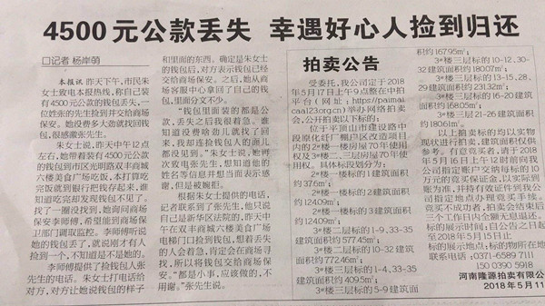 5月11日,平顶山晚报和平顶山新闻网分别刊登《4500元公款丢失 幸遇好心人捡到归还》的感谢文章。很快,这篇新闻被河南省平顶山市新华区人民法院干警不断转发和议论。原来,这个拾金不昧的人是该院党组成员、纪检组长张林。谈及事情的经过,他淡淡的说:“我没想太多,都是小事,应该做的”。