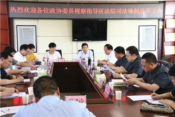 视察组一行实地察看了石龙区人民法院的诉讼服务中心、智能法庭、廉政文化长廊、多功能执行指挥中心等功能设施。随后听取了武中立对区法院近年来司法体制改革主要工作情况的通报。石龙区法院严格落实立案登记制,设立了诉前调解办公室,建立特邀调解员制度,尽力把纠纷化解在基层,消除在萌芽状态。同时,着力推进以政务网为依托的审判流程、裁判公开、执行信息和庭审网络视频直播四大公开平台建设,积极构建阳光司法机制,不断满足群众的知情权。以科学配置审判资源为目标,建立了法官和审判辅助人员职业保障制度,建立科学的法官审理案件模式,积极推进院领导办案常态化,全力保障审判和执行中心工作顺利开展。座谈会上,政协委员们就如何更好的深入推进石龙区法院司法体制改革及改进审判质量提出了意见和建议。