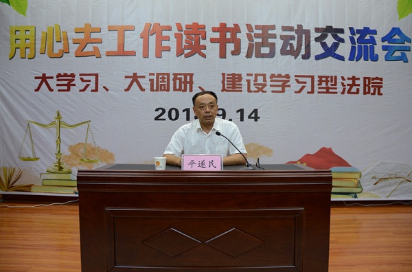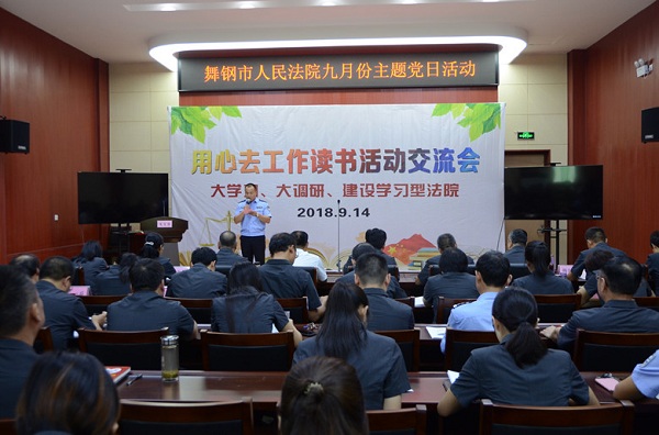 为了深入学习习近平新时代中国特色社会主义思想,进一步转变工作作风,提高工作质效,培养专家型法官,建设学习型法院,推动法院各项工作新发展,9月14日,舞钢市人民法院开展“大学习 大调研 建设学习型法院”主题党日活动——用心去工作读书活动交流会,舞钢市人大常委会主任平遂民出席活动。