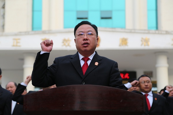 8:10分,在嘹亮的国歌声中五星红旗迎风而起,鲁山县法院全体干警整齐列队,表情严肃齐向国旗行注目礼,在党组书记、院长王宏伟的领誓下,齐声向宪法庄严宣誓。