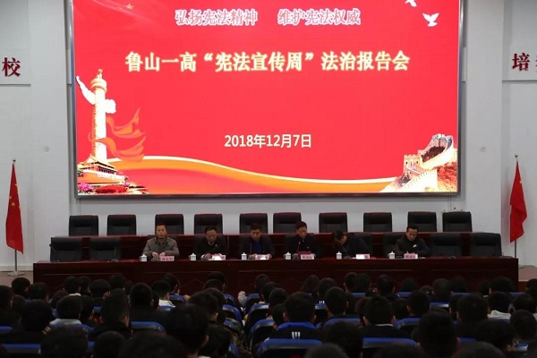 2018年12月7日,在鲁山县一高大礼堂内,刚刚吃过晚饭的600余名师生迎来了由鲁山县人大常委会副主任王国锋、鲁山县法院王宏伟院长共同带来的一堂精彩纷呈的宪法宣讲课,全景展示宪法发展历程,内容丰富;宪法内容与热点案例相互穿插再加上现场互动,气氛活跃,引来学生们的阵阵掌声。鲁山县人大法工委主任王延生、鲁山一高副校长徐永利等也参加了宣讲会。宣讲会由鲁山县政协副主席、鲁山一高校长、党委书记牛山坡主持。