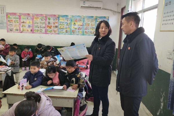 12月18日,平顶山市中级人民法院驻河南村第一书记王全胜、驻村干部马伟明与平顶山市中级人民法院少审庭法官一起走进鲁山县赵村镇第七小学,为这里的留守儿童送去一份法律关怀。