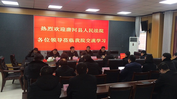 1月25日下午,唐河县法院副院长彭德泉带领相关部门负责同志一行11人到舞钢法院交流工作,先后到立案庭、信访接待室、调解中心参观交流,之后进行了座谈。舞钢法院党组书记、院长徐合林,党组成员、副院长华广平,党组成员、执行局长杨红波及相关庭室负责人出席了座谈会。