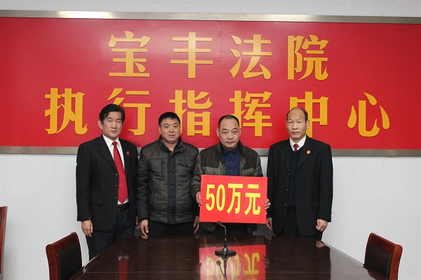 1月25日,鹤壁市某劳务服务公司代理人马某赶到宝丰法院,从宝丰法院副院长徐长星和宝丰法院执行局长张建立手中接过50万元的标的款支票。马某激动地说:这笔血汗钱终于有眉目了!