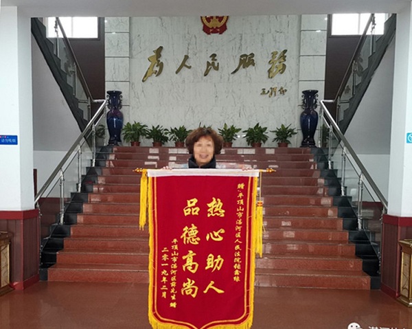 2月21日上午,市民薛先生委托其妻子来到湛河区法院,将一面写有“品德高尚 乐于助人”的锦旗送到湛河区法院执行局,以表达对执行局干警张鑫源同志的感谢。
