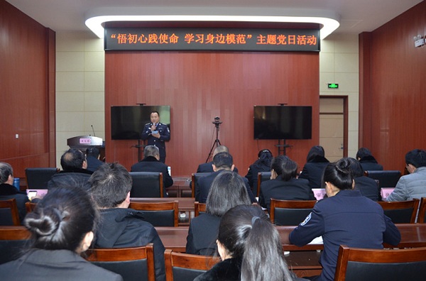 为引导全院广大干警坚定理想信念,在践行“四个意识”和“四个自信”上勇当先锋, 3月7日下午,舞钢市人民法院举行“悟初心 践使命 学习身边模范”三月份主题党日活动。