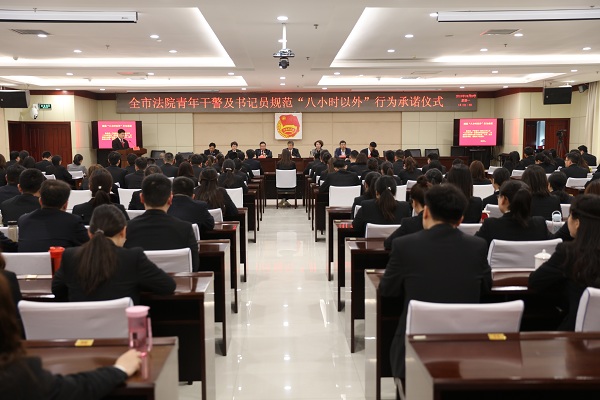 4月29日下午,平顶山市中院举行全市法院青年干警及书记员规范“八小时以外”行为承诺仪式,承诺仪式结束后,市纪委监委派驻市中院纪检监察组组长乔义恩对全体青年干警及劳务派遣书记员进行了集体廉政谈话。