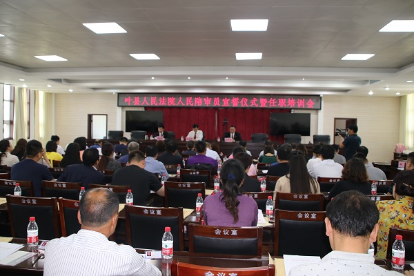 叶县法院为全面贯彻落实《人民陪审员法》和《人民陪审员选任办法》的相关要求,5月17日上午9时,召开人民陪审员宣誓仪式暨任职培训会,着力推进司法为民、司法公开。叶县法院在家院领导、各审判庭庭长、以及新任命的100名人民陪审员参会,会议由审委会专职委员马书扬主持。