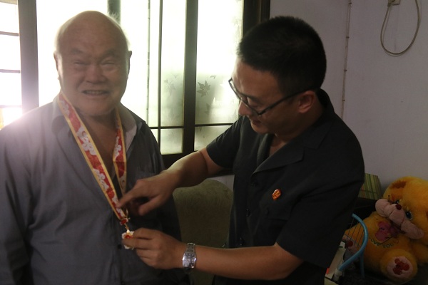 为庆祝新中国成立70周年,9月26日上午,石龙区法院党组成员、政治部主任王洪哲一行到石龙区法院离休老干部沈启振老人家中慰问,送去慰问品,并为其佩戴“庆祝中华人民共和国成立70周年”纪念勋章。
