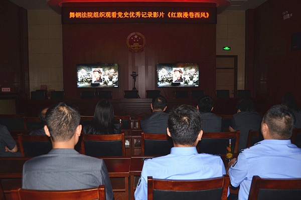 为庆祝中华人民共和国成立70周年,助推“不忘初心、牢记使命”主题教育工作持续深入开展,9月26日下午,舞钢市人民法院组织全体干警集中观看了党史教育影片《红旗漫卷西风》。