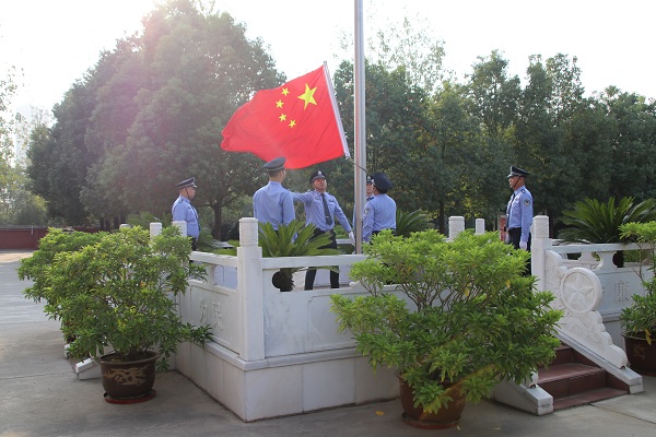 六名法警列队出旗,队列整齐划一,步伐铿锵有力,口号响彻云霄,伴随着雄壮豪迈的国歌,鲜艳的五星红旗在全体干警的注目下冉冉升起。