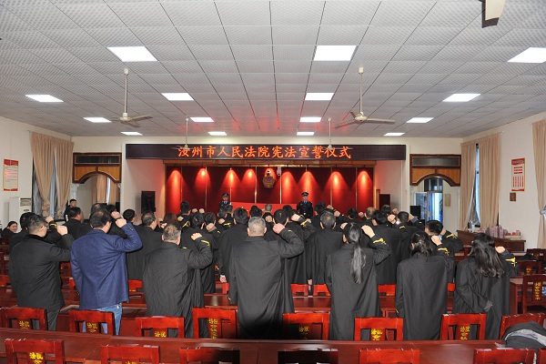 宣誓仪式伴随奏唱国歌正式开始,全体员额法官身穿法袍,面向国旗,用坚定而洪亮的声音宣誓:“忠于中华人民共和国宪法,维护宪法权威,履行法定职责,忠于祖国、忠于人民,恪尽职守、廉洁奉公,接受人民监督,为建设富强、民主、文明、和谐的社会主义国家努力奋斗!”铿锵有力的誓言更增强了人民法官司法为民、公正司法、廉洁司法的决心和信心,同时也是汝州市法院学习宪法、忠于宪法、弘扬宪法精神的生动实践。