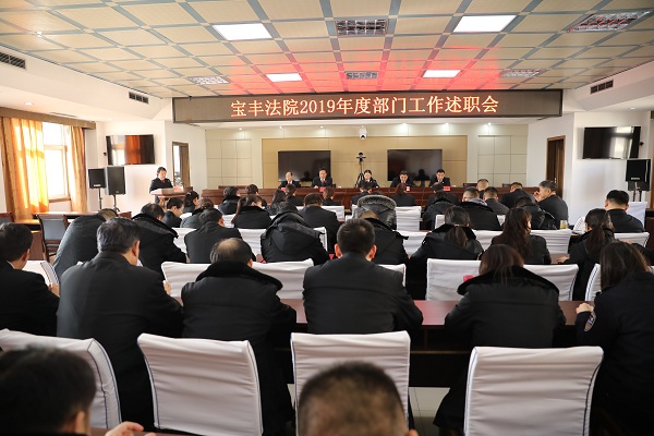 1月20日下午,宝丰县人民法院召开2019年度部门工作述职会。各部门负责人根据自己工作实际情况和工作任务指标完成情况进行述职述廉。会议由院党组成员、纪检组长王红军主持,院班子成员及全体干警参加会议。