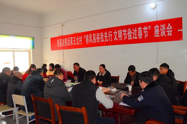为深入推进移风易俗,弘扬时代新风,1月20日上午,郏县法院结合“五大活动”,在薛店镇冢王北村村部召开了“移风易俗我先行 文明节俭过春节”座谈会。郏县法院党组成员马惠敏、驻村第一书记岳俊琦、网格员及冢王北村村干部、村民代表参加座谈。