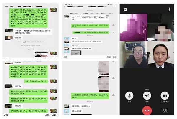 2月7日,闹店人民法庭通过微信视频开庭的方式审理一起离婚案件。王某某与李某某离婚纠纷一案在闹店人民法庭以微信视频的形式进行了庭审。庭审前,承办法官徐烨晗在征得双方当事人的同意后,与双方当事人及书记员建立了微信群,并告知双方注意事项,通过在微信群以视频的方式完成了全部的庭审过程并进行了全程的录音录像,案件双方当事人通过微信确认了对庭审笔录无异议,庭审过程非常顺利,达到了抗击疫情与执法办案两不误的效果。
