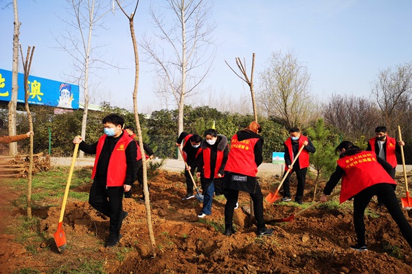 阳光明媚,春风宜人,正是植树好时节。与往年不同的是,今年由于新冠肺炎疫情的影响,志愿者们都戴上了口罩。口罩遮住了容颜,却遮不住大家的干劲儿和热情。挥锹、铲土、扶苗、培土,分工协作,有条不紊。在大家齐心协力的劳动过后,一株株树苗迎风挺立,仿佛傲然不屈的战士,誓要守卫好自己的家园。