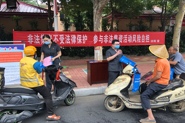 为进一步加大防范和打击非法集资宣传力度,有效遏制非法集资活动,切实维护人民群众的根本利益,6月15日上午,郏县法院组织干警在辖区行政路开展了以“守住钱袋子•护好幸福家”为主题的宣传活动。