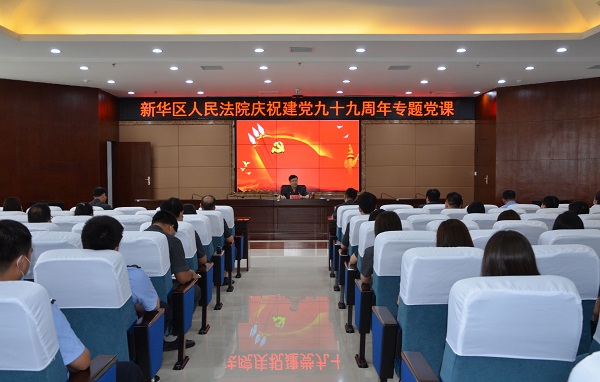 在建党节99周年到来之际,为提升党员干警的党性修养,增强党员干警的宗旨意识,6月30日下午,新华法院召开专题党课,新华法院党组书记、院长杨红卫及全体干警参加会议。