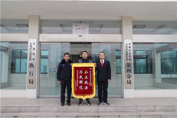 “感谢石龙区法院!感谢执行法官!我公司的执行案件终于得到了解决……”2021年1月26日上午,河南万盾建筑工程有限公司负责人将印有“公正执法、为民解忧”的锦旗送到石龙区法院执行局副局长(承办人)黄霄手中,一面锦旗承载着的不仅是对该院执行局干警的感谢,更多的是对该院执行工作的肯定。