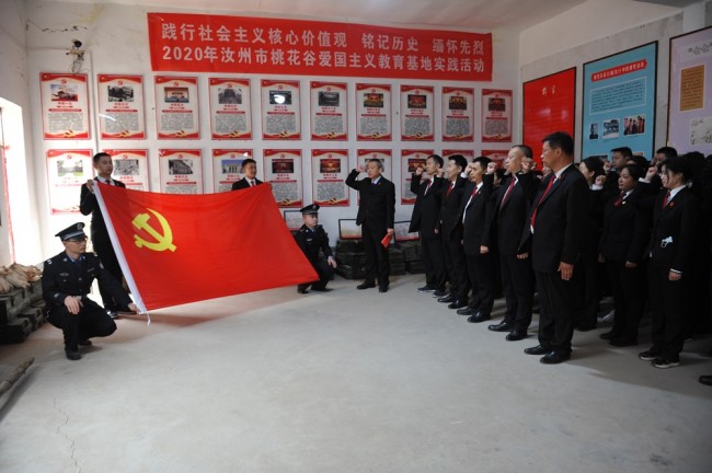 参观后,在院党组书记、院长杨长坡的带领下,党员干警们面向党旗,整齐列队、右手握拳,重温入党誓词。