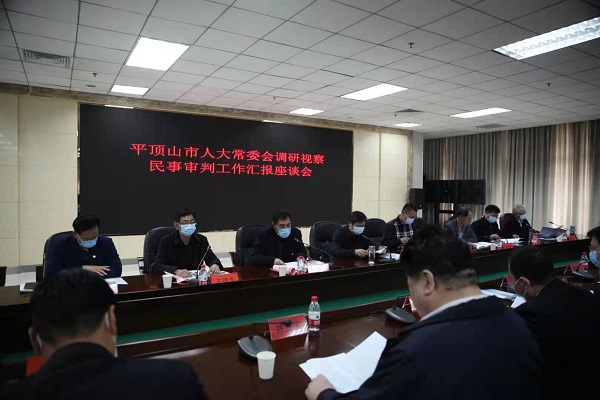 3月24日下午,平顶山市人大常委会副主任闫廷瑞带领市人大调研视察组一行九人,到平顶山中院调研视察民事审判工作。市中院党组书记、院长王辉陪同调研视察,中院班子成员、相关部门负责人、民事员额法官代表参加汇报座谈会。