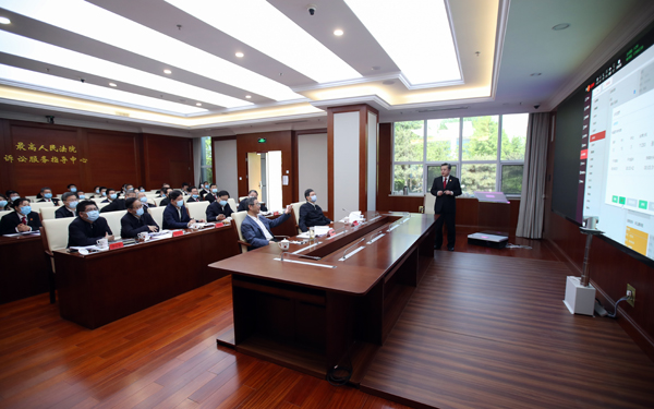 周强认真听取工作汇报,仔细了解最高人民法院诉讼服务指导中心信息平台运行情况。信息平台上,各地法院诉讼服务质效数据清晰呈现、一目了然。周强浏览指标数据,察看调解、送达、信访等各平台运行状况,并随机选择部分基层法院,通过视频查看诉讼服务大厅实时运转情况。看到全国法院诉讼服务质效不断提升,各地法院诉讼服务大厅运转有序,周强很高兴,要求紧密结合在党史学习教育中开展的“我为群众办实事”实践活动,采取扎实有效措施,巩固拓展一站式建设成果,更好地服务人民群众。