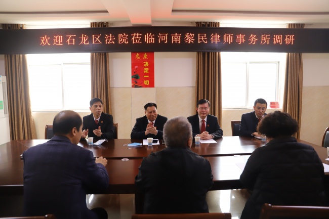 为深入开展“能力作风建设年”活动,扎实推进法治化营商环境工作,3月2日,受石龙法院党组书记、院长武中立委托,党组成员、副院长王广跃,副院长孙延辉,党组成员、审委会专职委员简春刚带领干警到河南黎民律师事务所就法治化营商环境工作开展调研并召开座谈会。