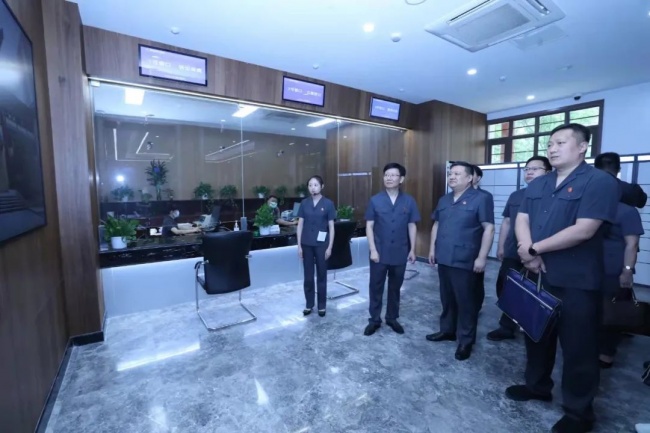 9月16日上午,考察组在重庆破产法庭庭长吴洪陪同下,先后参观了法庭诉讼服务中心、司法警务中心、数据集控中心、多媒体会议室、专业法官会议室、图书阅览室等功能区域,并观看重庆法院破产审判专题宣传片。
