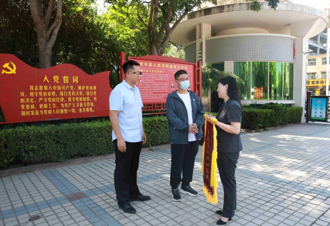 6月8日上午,陈某某将一面印有“廉洁高效倾心为民,秉公办事执法如山”的锦旗送到了宝丰县人民法院立案庭速裁团队王晓芬法官手中,并说道:“谢谢你们团队的倾心付出,为民解忧,真是太感谢了。”