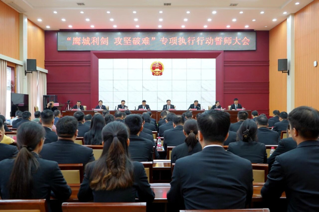 会上,市中院执行局副局长王永生宣读了《关于开展“鹰城利剑 攻坚破难”专项执行行动的通知》,各基层院签订了“鹰城利剑 攻坚破难”专项执行行动目标责任书,并对开展专项执行行动进行誓师发言。