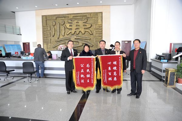 平顶山法院网讯 12月8日上午,新华区青石山办事处井营村村民孙荣花代表其母亲及姐姐向中院赵鹏举院长、严凤香庭长、李勇法官赠送锦旗,感谢中院在办理孙群拴与刘秀欣分家析产纠纷一案中秉公执法,心系百姓。