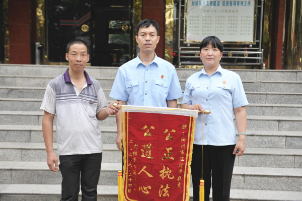 平顶山法院网讯 2014年6月24日下午,汝州市杨楼镇马庄村村民宋某某,将一面写着“公正执法、公道人心”的锦旗送到汝州市人民法院,对法官公正司法、倾心调解的行为表示感谢。