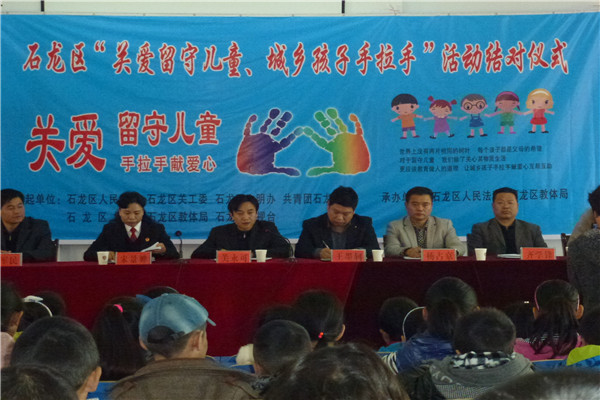 石龙区法院为进一步营造有利于留守儿童健康快乐成长的和谐环境,11月13日,该院联合区关工委、文明办、教体局、妇联、团区委等单位发起了“关爱留守儿童,城乡孩子手拉手”社会公益活动,在石龙区三十二中举行结对仪式,向全区社会各界发出倡议,呼吁更多的爱心人士关爱留守儿童,呵护他们健康成长。区政府副区长关永可,区法院院长宋景婵、区委政法委副书记王墨珂、区关工委主任杨占京、区教体局局长张立有、区广电局副局长齐学峰、区妇联主席孙书亚、团区委副书记刘向平等单位领导出席活动。活动由区法院政治处主任梁剑峰主持。