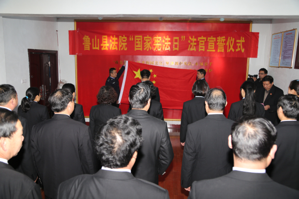 “我是中华人民共和国法官,我宣誓:忠于祖国,忠于人民,忠于宪法和法律……”!12月4日下午15时整,全国首个宪法宣传日来临之际,鲁山县法院二楼法官宣誓室正在举行法官宣誓仪式。包括8名初任法官在内的40名法官在鲁山县法院党组书记、院长李俊峰的带领下,高举右手,面对五星红旗,庄严宣誓。
