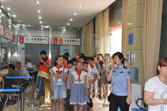 当天上午,受邀人员在引导员的带领下,分别参观了法院诉讼服务中心、民事庭、网络直播法庭、执行局综合科、当事人安全通道、刑庭、少审庭、行政庭、廉政文化长廊、机关餐厅,亲身体会了法官们的工作、生活状态。受邀的师生还来到庄严的少年审判法庭进行参观,同学们坐在法官、检察官的位置上,俨然一副小法官、小检察官的模样。其后少审庭的法官结合真实的青少年犯罪和未成年人被侵害的典型案例,通过与同学们问答互动的形式,对法律是什么、法律与同学们有什么关系、如何用法律武器来保护自己等内容进行了深入浅出的讲解。法官强调,同学们要严格遵守法律法规,提高自我防范意识,自觉抵制各种不良行为、不良风气对自身的侵袭,同时还要善于用所学的法律知识维护自身权益,取得良好效果。
