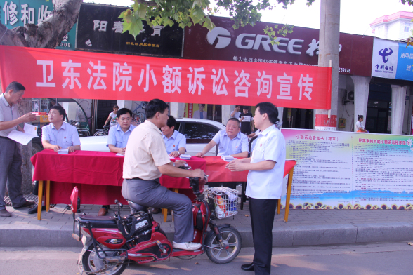 宣传版面前,不时有过往的市民驻足阅读小额诉讼简介、适用条件、注意事项等,前来宣传的干警热情地做着讲解工作,并把印制的宣传资料发放给市民们。在小额诉讼制度正式确立后,卫东区人民法院就已经制作了小额诉讼宣传展板,在院立案庭门前进行陈列,立案庭干警也利用立案时机对前来立案的当事人、当事人家属进行小额诉讼普及宣传。截止今年9月15日,卫东法院已立案小额诉讼案件175件,既有符合法律规定条件而立为小额诉讼的案件,也有当事人协议选择适用。通过周末普法宣传工作,一定能够使该项制度为更多市民了解选用,使这项便民的制度设计真正高效、便民。