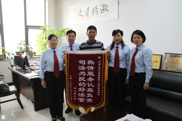 10月23日上午,从鲁山赶来的当事人殷某,将一面写着“热情服务认真负责司法为民的好法官”的锦旗送到中院民一庭。