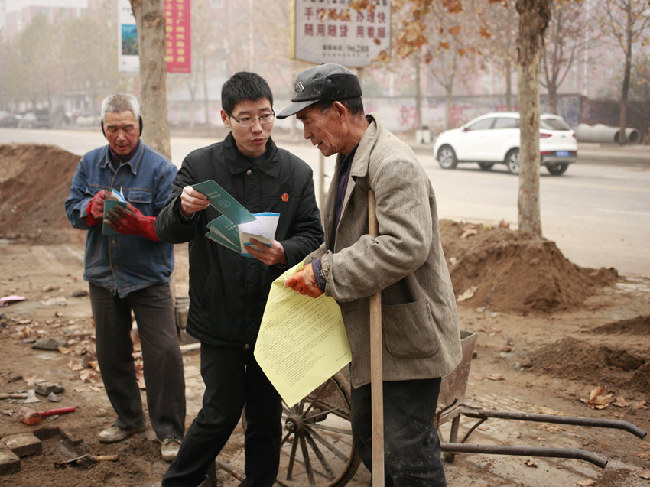 11月28号,冬季里第一场雪留下的印记已经消退,工地上一双双勤劳的手再次忙碌起来。在嘈杂的轰鸣声中,有几个身影不时的出现在工人朋友身边,那是宝丰法院的同志用周六空暇时间来到施工工地,在为农民工朋友进行司法宣传。