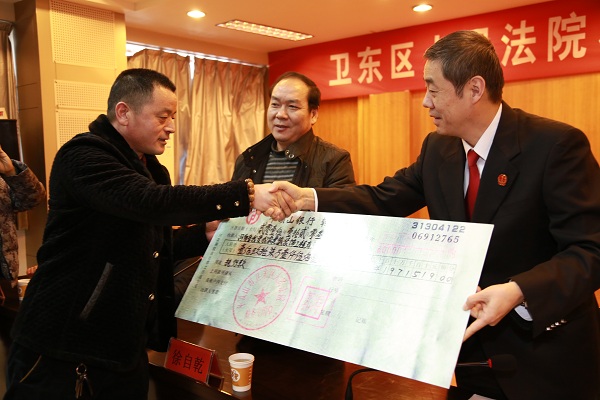 随后,刘冠华与徐自乾现场将190余万元转账支票送到农民工代表杜某手中。接到工资款的杜某,在发言时激动地说:谢谢法官为我们要回工钱,为我们办了好事,总算可以好好回家过个年了,太感谢了!