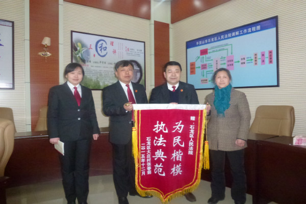 近日,石龙区法院成功调解并履行到位一起涉农维权案件,经过多方努力,双方当事人当场达成调解协议,并主动履行了赔偿款115000元。针对法官所付出的努力为当事人讨回赔偿款,解决了纠纷,原告深表感激,并送来锦旗一面。