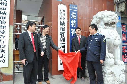 接着杨长坡院长致辞。他指出,城市管理综合巡回法庭的设立是规范城市管理行政机关执法,保证执法公正性的有效途径。它的建立将有利于快速审查和执行城市管理行政机关申请的非诉行政执行案件,缓解群众抵触心理、抑制矛盾激化,捍卫城市管理领域法律法规的法律效力,促使城市管理执法工作公平、公正、公开,从而改善我市人文居住环境。要求城市管理综合巡回法庭加强与执法单位的协作,创新思路,积极作为,建立完善规范的工作机制,及时化解城市管理纠纷,促进社会和谐,为汝州在新的历史起点实现新跨越,做出新的更大的贡献。