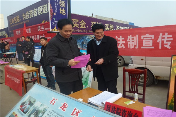 在普法现场,石龙区法院的法官们热心、细心、耐心地接待每一位群众,就群众日常关心的婚姻家庭纠纷、劳动争议纠纷、房屋买卖纠纷等热点、难点问题提供法律咨询,当场发放《当事人诉讼权利义务》、《生活中的小案例》等普法资料1200余份。民庭的法官们通过群众喜闻乐见的普法载体,着重向妇女同志宣传了《中华人民共和国婚姻法》、《中华人民共和国妇女权益保护法》以及《中华人民共和国反家庭暴力法》等与妇女维权密切相关的法律知识,同时还特别对农民工、“三留守”人员及部分困难群众详细介绍了法律援助和司法救助规定,鼓励他们运用法律武器有效保护自身合法权益。执行法官也就群众关心的公布失信被执行人名单及依法打击拒不执行判决、裁定等犯罪行为的相关规定做了全面解答,并现场为老百姓解决执行难题。