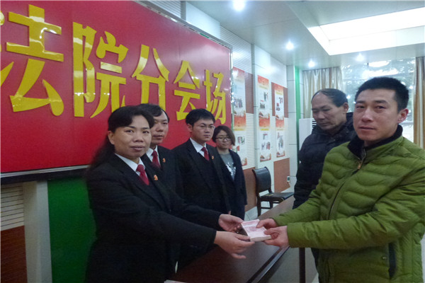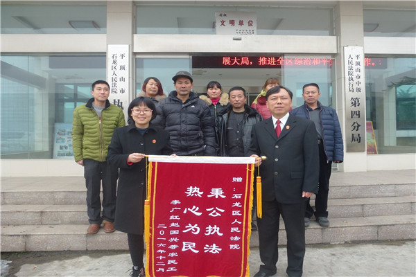 28日上午9时,在石龙区法院会议室内举行了简短的欠薪发放仪式。党组书记、院长宋景婵亲手将这批拖欠的工资款一一发放到农民工手中,并叮嘱农民工们在生产生活中遇到欠薪或其他需要解决的问题时,不要采取过激的行为,要通过合理合法的途径解决,这样才能维护好自己的合法权益。现在企业经济形势不好,资金周转困难,但是我们会尽最大的努力,为你们争取应的的权益。宋院长话音刚落,会议室中就响起了热烈的掌声。最后,24名农民工和他们的维权律师一起,手捧“秉公执法、热心为民”的锦旗与法院领导和干警们合影留念。