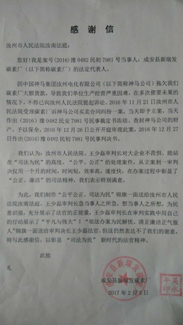 春节过后刚上班,汝南法庭就收到一封来自外省的快递信件,拆开一看,是一封热情洋溢的感谢信,寄件人是河北省成安县瑞发碳素厂。