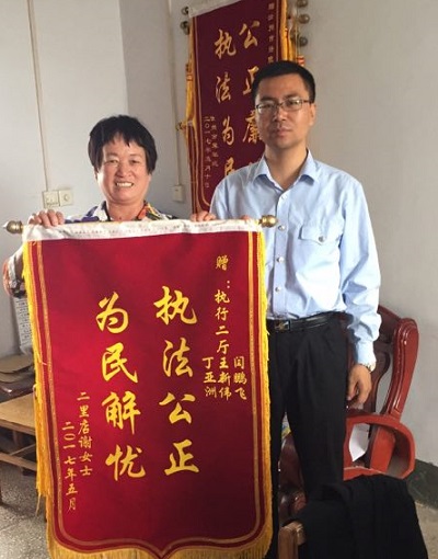 “‘当之无愧’!我对你们的工作的评价就这四个字!”2017年5月15日,申请人尚某之妻谢某将一面写有“执法公正,为民解忧”的锦旗送到汝州市人民法院执行局执行二庭,并激动地不断重复着文章开头的那句话。