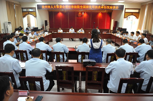 座谈会上,杨长坡院长从审判权运行机制改革、立案登记制改革、以审判为中心的诉讼制度改革、人民陪审制度改革、执行体制改革、构建阳光司法机制、对司法活动的监督制约等八个方面汇报了汝州法院司法改革工作的进展情况,并从组织和自查两个方面汇报了迎接市人大2017年年度办案质量检查的准备工作,列出了自身存在的问题和困难,提出了下一步工作打算。视察组成员分别发表了视察意见,提出了意见建议。胡洪献同志作总结发言,他在充分肯定市法院近年来各项工作特别是司法改革工作取得成绩的同时,对汝州法院提出要求:在深化司法改革认识上抓提高,把握改革标准和方向;在维护司法公平正义上抓提质,搞好审判改革、执行改革、责任制改革;在促进阳光司法上搞提升,提高办案质量。杨长坡同志表示,汝州法院将以此次视察为契机,狠抓落实,开拓进取,以只争朝夕的精神,以优异的成绩向党和人民交上满意的答卷。